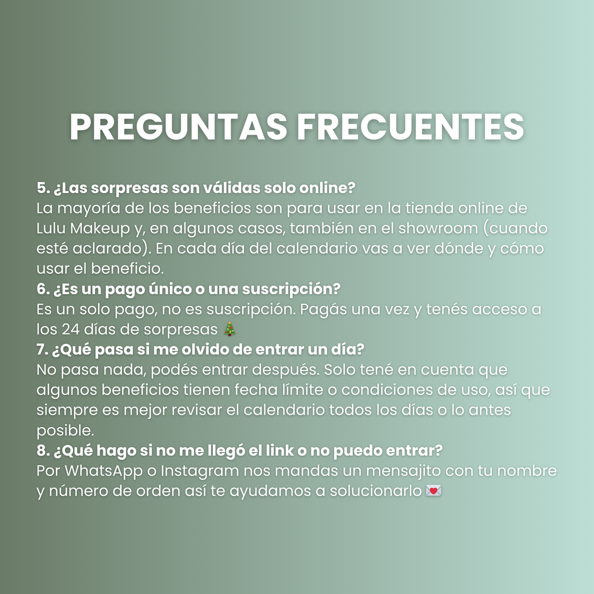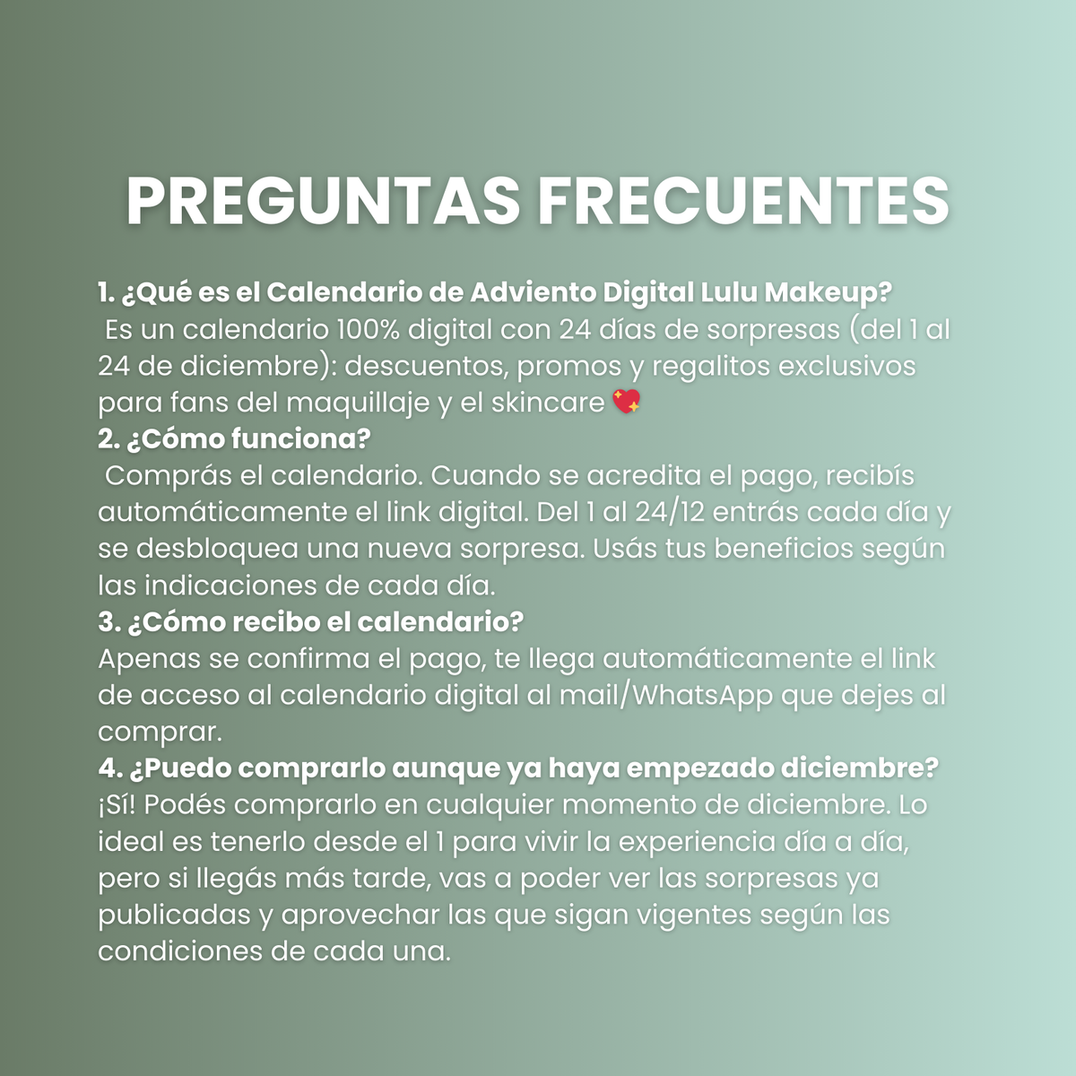 Al ser un servicio digital, tu compra es súper segura: una vez que se confirma el pago, recibís automáticamente el link de acceso al calendario, sin tener que esperar a que alguien lo envíe manualmente. Guardás ese link y listo: solo tenés que volver a entrar cada día para descubrir tu nueva sorpresa.