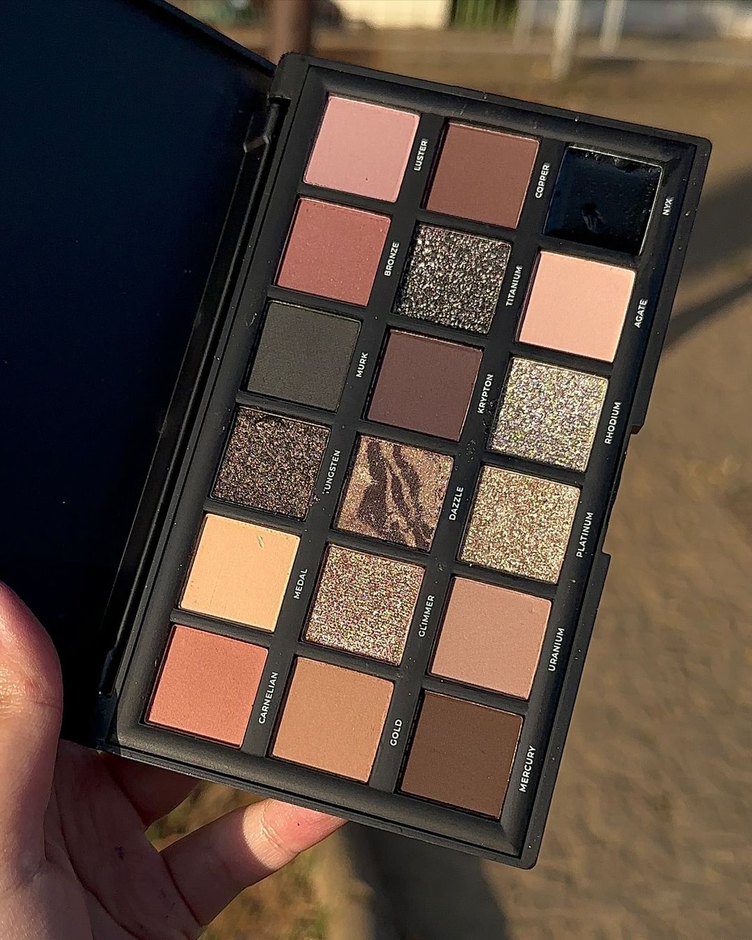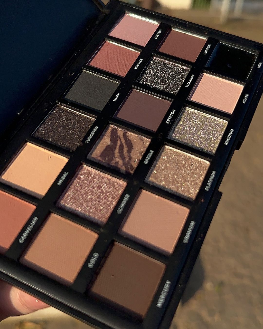 - 11 sombras matte; 5 sombras metálicas; 1 sombra glitter cremosa; 1 sombra en gel.