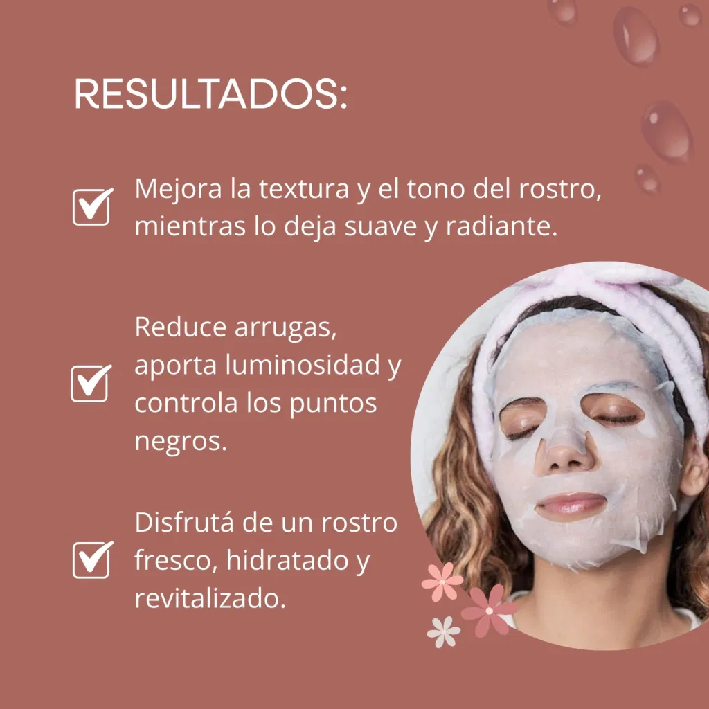 | Limpia bien tu rostro para una mejor absorción. | Distribuí una capa uniforme en todo el rostro. | Relajate y dejala reposar por el tiempo recomendado. | Retirá y sentí la piel fresca y renovada. |